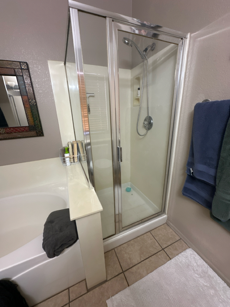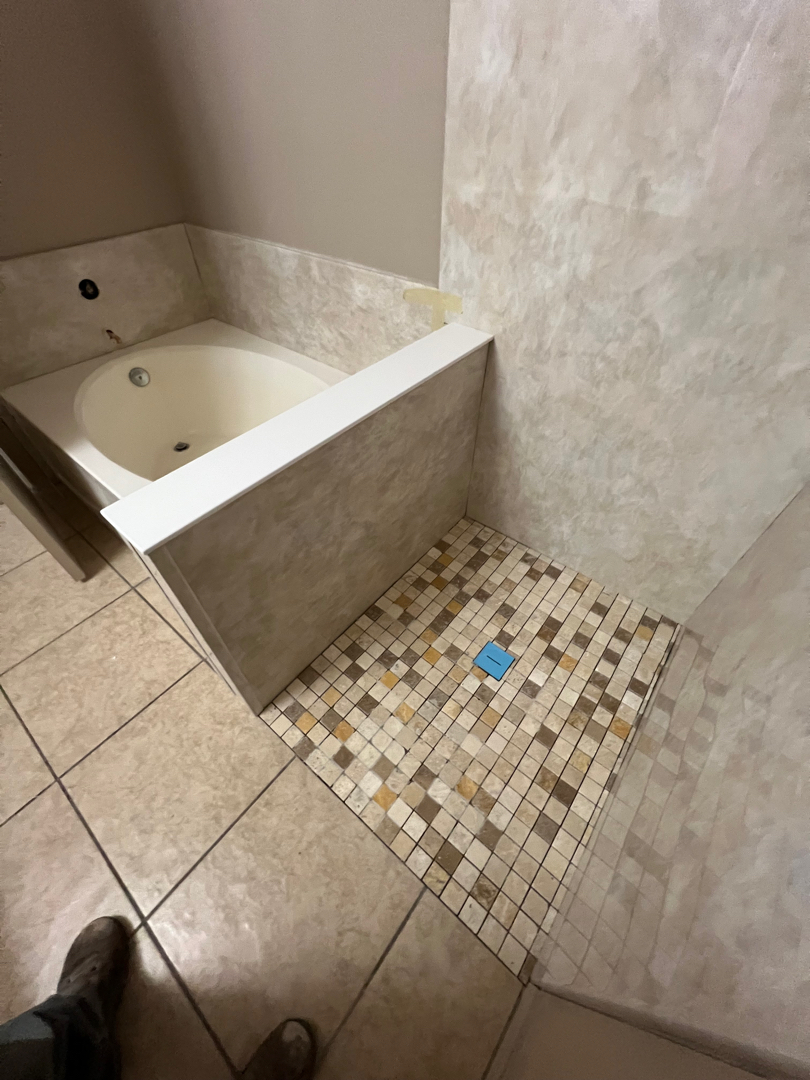 The tub area didn’t get left behind, either. We refreshed the surround with a matching travertine finish, creating a cohesive look throughout the bathroom. And while the custom frameless glass enclosure is still on its way, the shower space is already functional — we even offered to hang a temporary curtain so there’s no delay in enjoying the new setup.