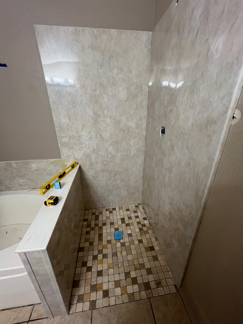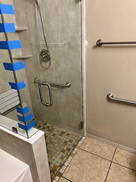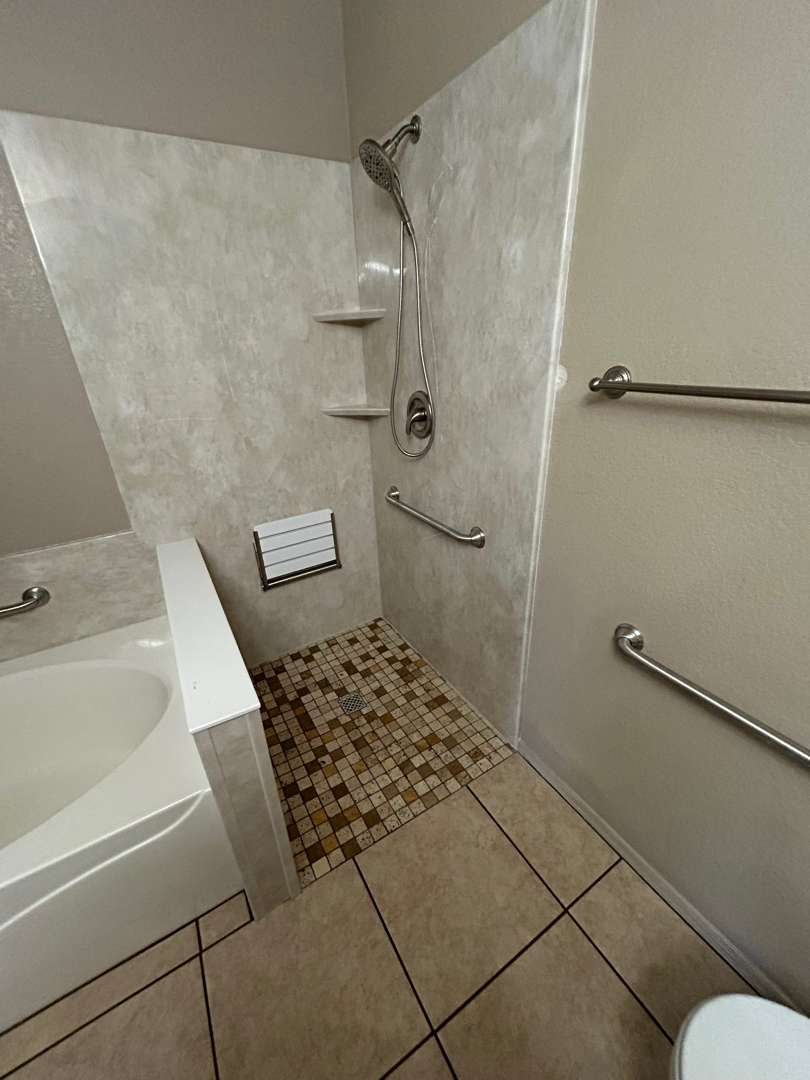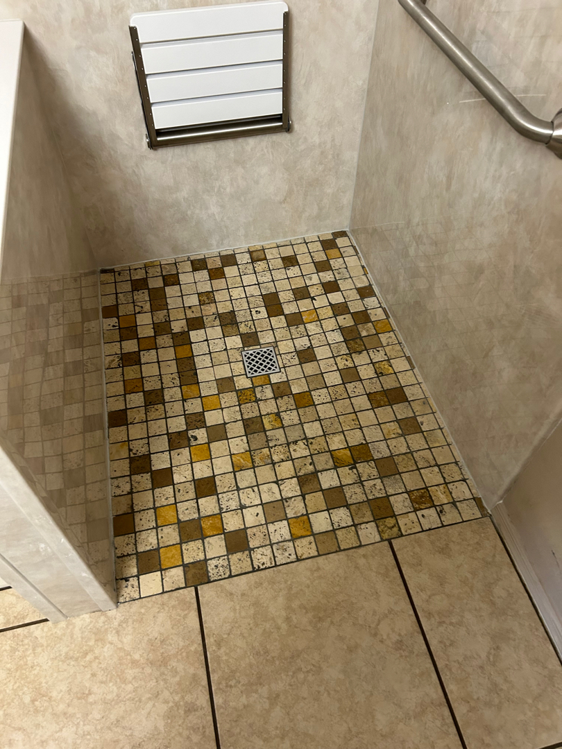 Once we cleared the space, it was time to build something better. We prepped the walls with moisture-resistant backing and installed sturdy support behind the scenes to anchor safety features later on. A beautiful mosaic-tiled, barrier-free shower pan was placed — not only slip-resistant but also a big step forward in making the space more accessible. It was paired with a three-wall acrylic surround in a warm travertine color that wrapped around the space like a spa. Everything was sealed tightly to ensure long-term durability and ease of maintenance.